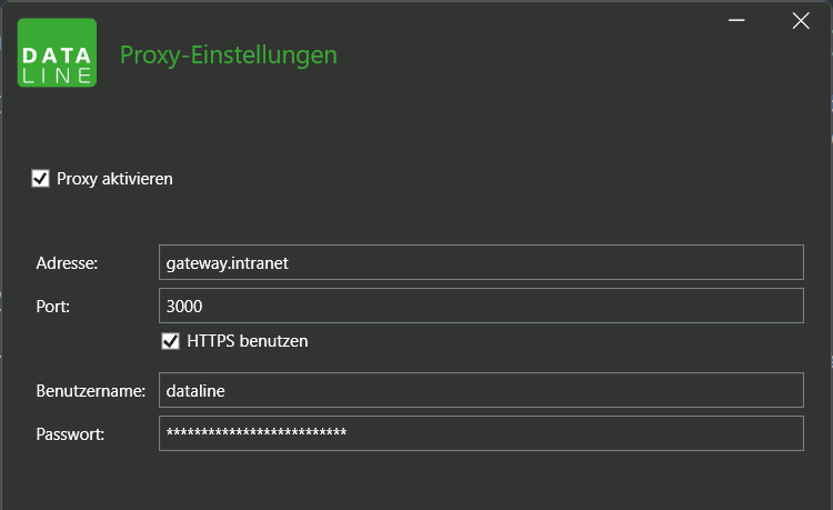 Der Proxy wird systemweit eingestellt und gilt dann automatisch für alle DATALINE Lohnabzug-Installationen und ihre Programmteile, inklusive dem Online-Updater und Olümp.